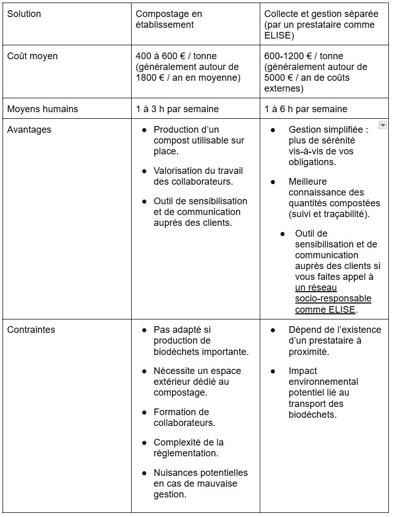 Depuis le 1ᵉʳ janvier 2024, les entreprises ne doivent plus mélanger leurs déchets alimentaires avec le tout-venant, qui est ensuite incinéré ou enfoui en décharge. Ils sont dans l’obligation de les trier et de les valoriser, soit en faisant appel à un prestataire spécialisé dans la collecte des biodéchets, comme ELISE, soit en mettant en place un processus de compostage.