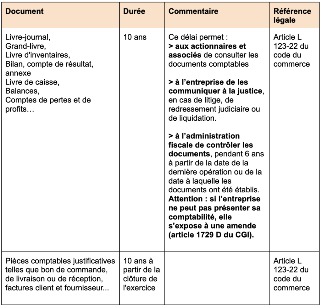 Les documents comptables sont à conserver pendant 10 ans ;
